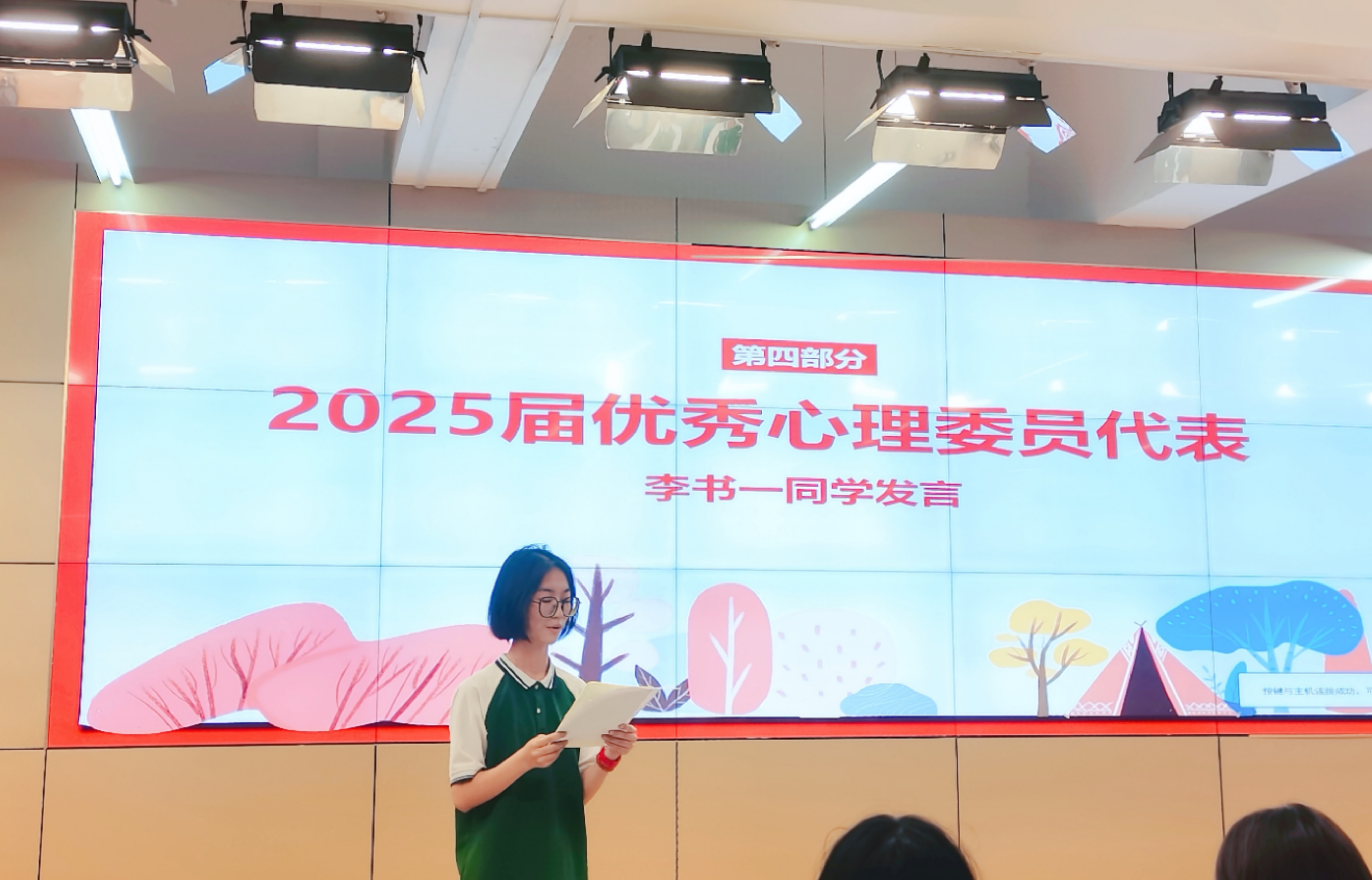 随后,优秀心理委员代表李书一同学发言,她从“关注自身心理健康 引领示范他人”、“善于倾听 提高自身助人能力”、“善于观察 积极向同学伸出援助之手”三个方面分享了自己作为心理委员这一年的成长历程和心得体会。李书一同学情真意切的发言引起了在座心理委员的共鸣,作为学校心理健康教育工作中重要的学生力量,每一位心理委员都要发挥自己的作用,共同营造积极健康的校园心理氛围。