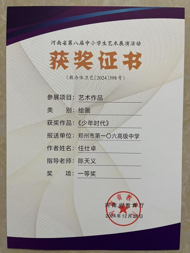 这个时值初春,绿意盎然,校园内一派暖意融融的日子里,我校捷报频传,任仕卓同学的作品《少年时代》获得河南省第八届中小学省艺术展演中获得一等奖,并代表河南省参加全国八艺现场赴长沙展演。