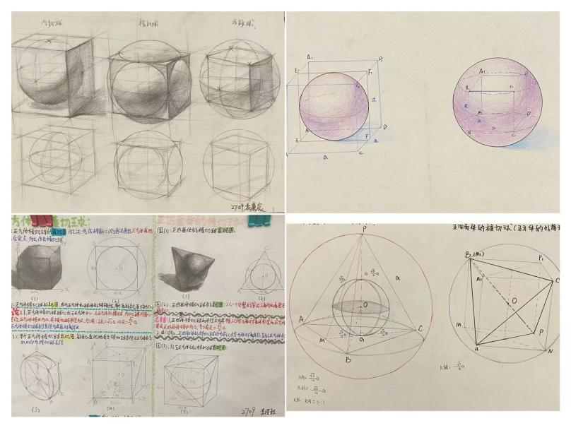 活动要求从六种图形中至少选取两种进行绘制。有的同学运用精准流畅的线条,清晰地勾勒出两者正方体的内切球与外接球之间的位置关系;有的同学则将目光投向正四面体的棱切球与外接球,巧妙地借助绚丽缤纷的色彩,凸显出图形强烈的立体感。在创作过程中,学生们不仅深化了对数学知识的理解,还将艺术审美融入其中,赋予了数学图形别样的魅力。