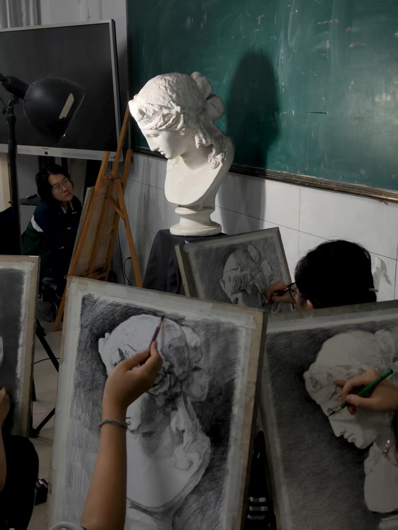 老师带领学生们进入画室,详细讲解了石膏像素描的基本技巧,包括线条的运用、光影的表现以及细节刻画。学生们认真观察、细心描绘,在浓厚的艺术氛围中,纷纷拿起画笔开始自己的创作。素描石膏像作为美术基础课程的重要组成部分,不仅能提高学生的观察力,还能锻炼他们的艺术感觉与表现能力。