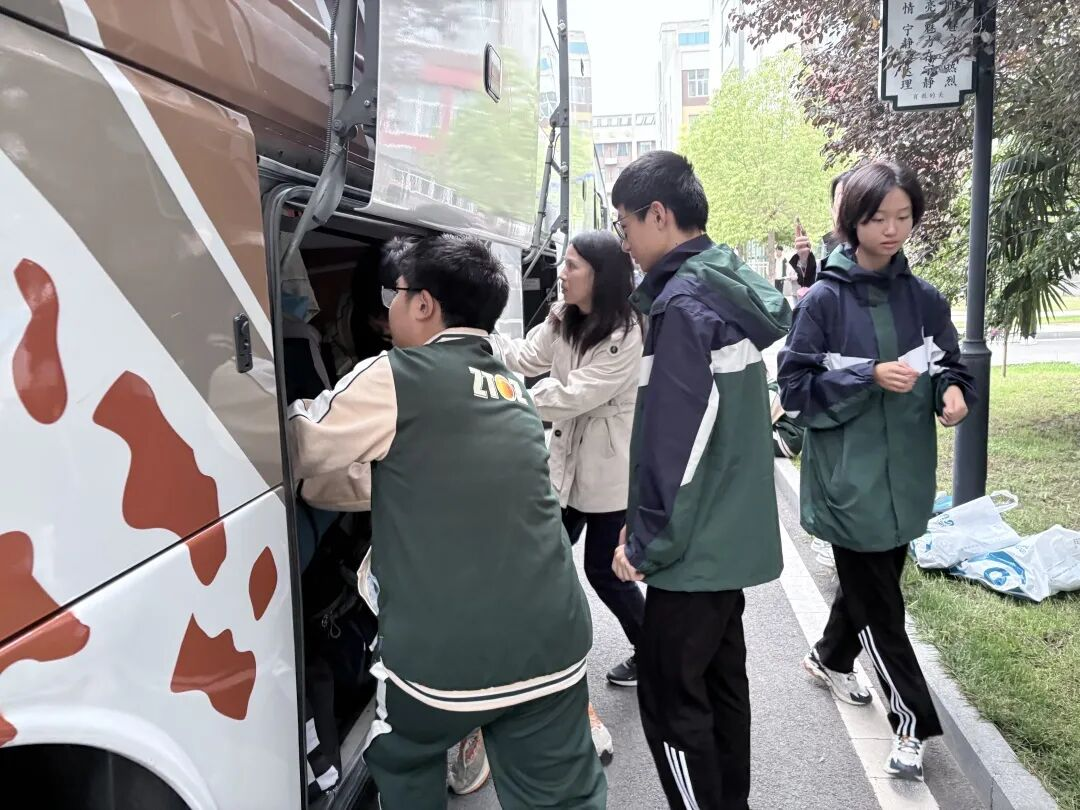 早晨的天气还有几分迷蒙,学生们已经早早地在学校集合。晨光熹微,负笈疾行,跃跃而动。班主任和美术老师清点人数,并帮助学生摆放行李。