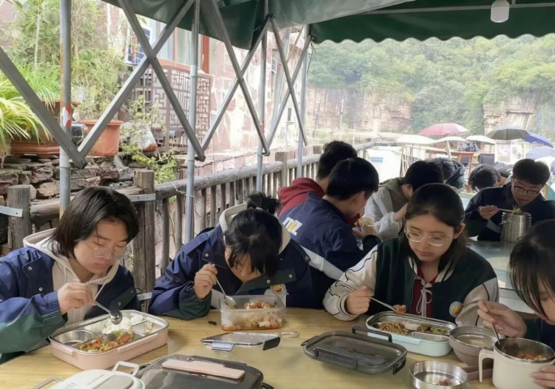 早读之后,同学们有序进入食堂。松软的馒头、金黄的煎蛋、热气腾腾的米粥,还有各色农家风味的炒菜,一一盛入碗盘。班主任走近学生餐桌,温和地叮嘱道:“要好好吃饭,只有营养充足,创作才更有力量。”班主任老师在一旁悉心陪伴,如同家人般关怀学生的饮食喜好,让离家的同学倍感温暖。上午的写生课程结束,荤素搭配的饭菜已准备妥当。同学们围坐一起,一边享受美食,一边交流着上午绘画的心得体会。雨雾透过窗户飘洒,带来微微凉意,萦绕在餐桌上的惬意中。饭后,同学们陆续回到宿舍午休。班主任老师轻声巡视寝室,逐一检查午休纪律,督促大家尽快休息,以饱满的精神状态迎接下午的写生活动。