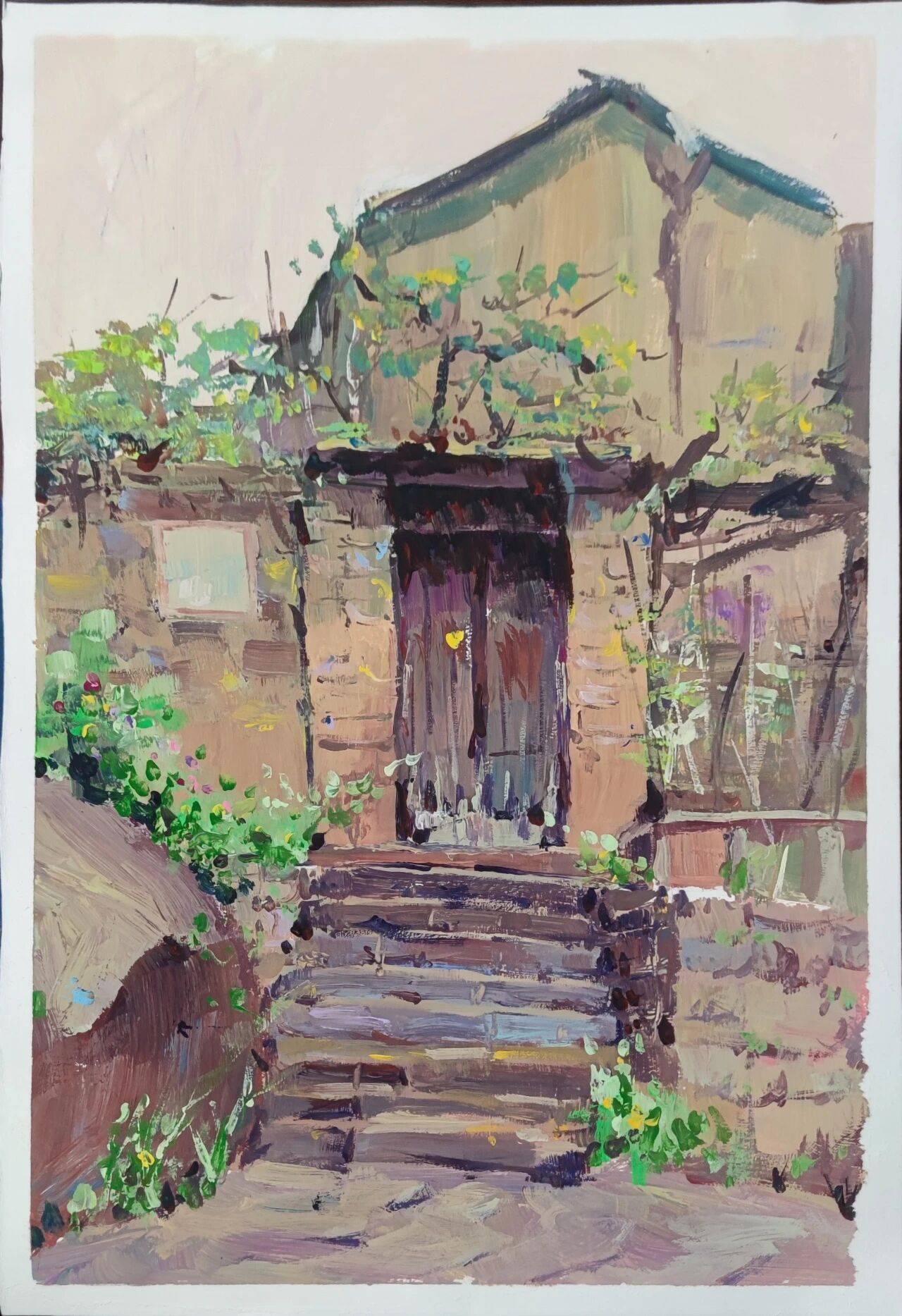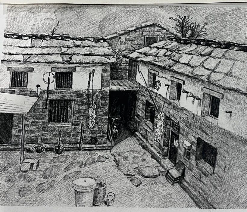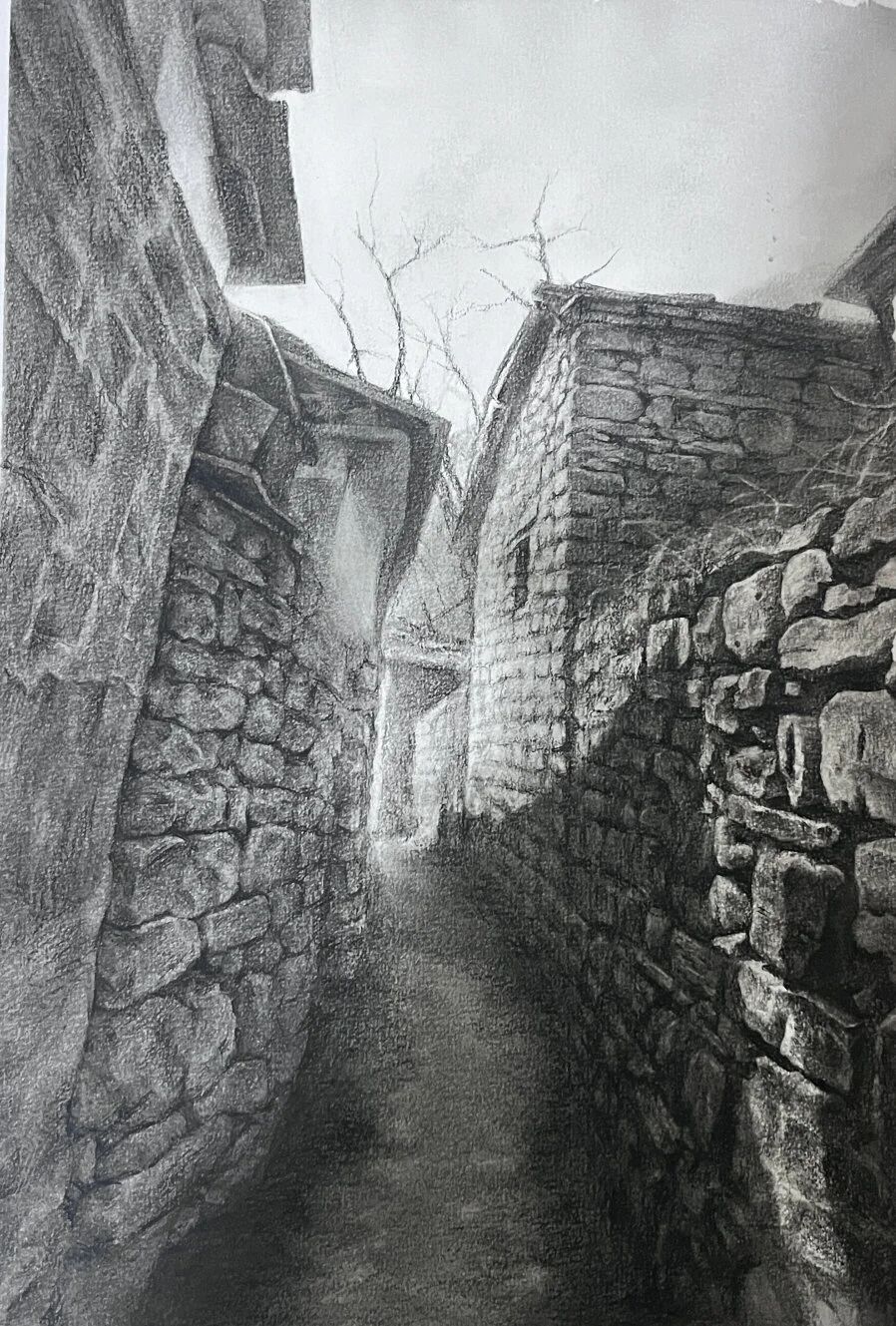 十月的石板岩完全没有了往日的清爽与冷峻,湿漉漉的雾水时不时从峡谷的另一端蔓延开来,混沌的天空和逐渐失色的悬崖悄悄融合,光影变得晦涩而迷蒙,这无疑给学生们作画增添了麻烦。同学们无惧这惨淡的天气,反而静下心来观天地而雕细微,一幅幅精彩的画作也呈现出来。挑战磨砺了意志,意志点染了心性,心性塑造了艺术。